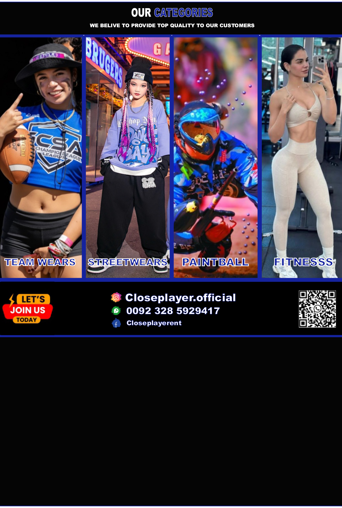Main categories: Team Wears,Street Wears,Fitness Wears,Falconry Products,Paintball Clothing